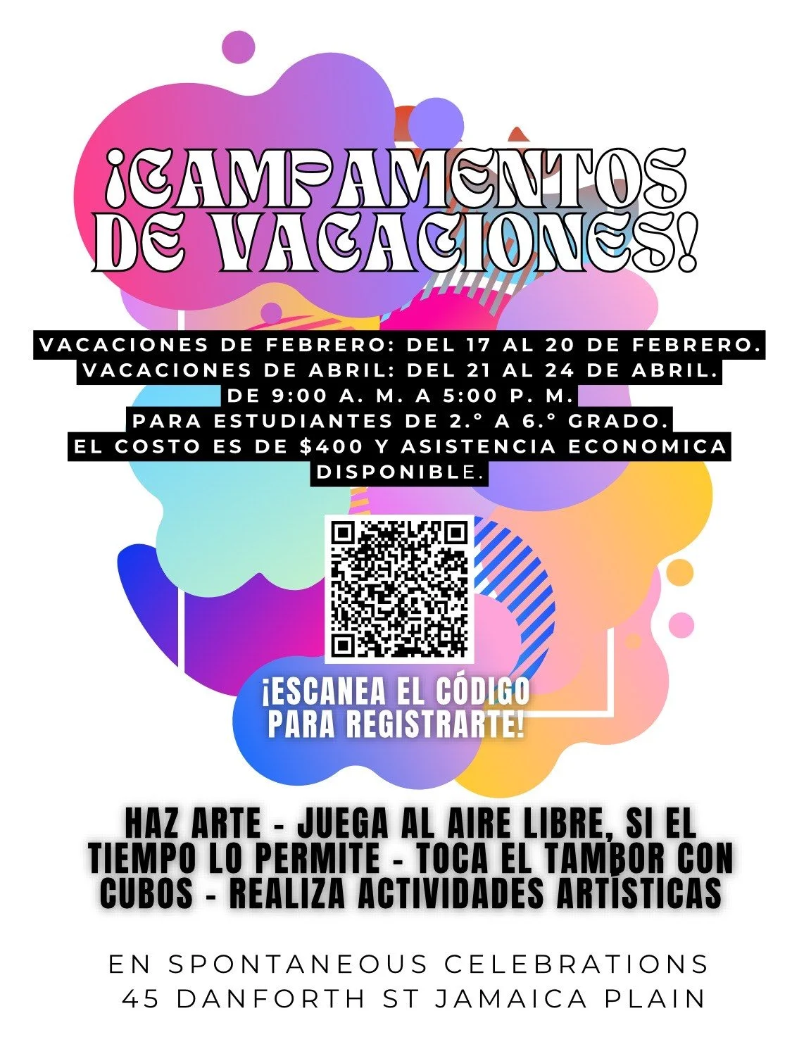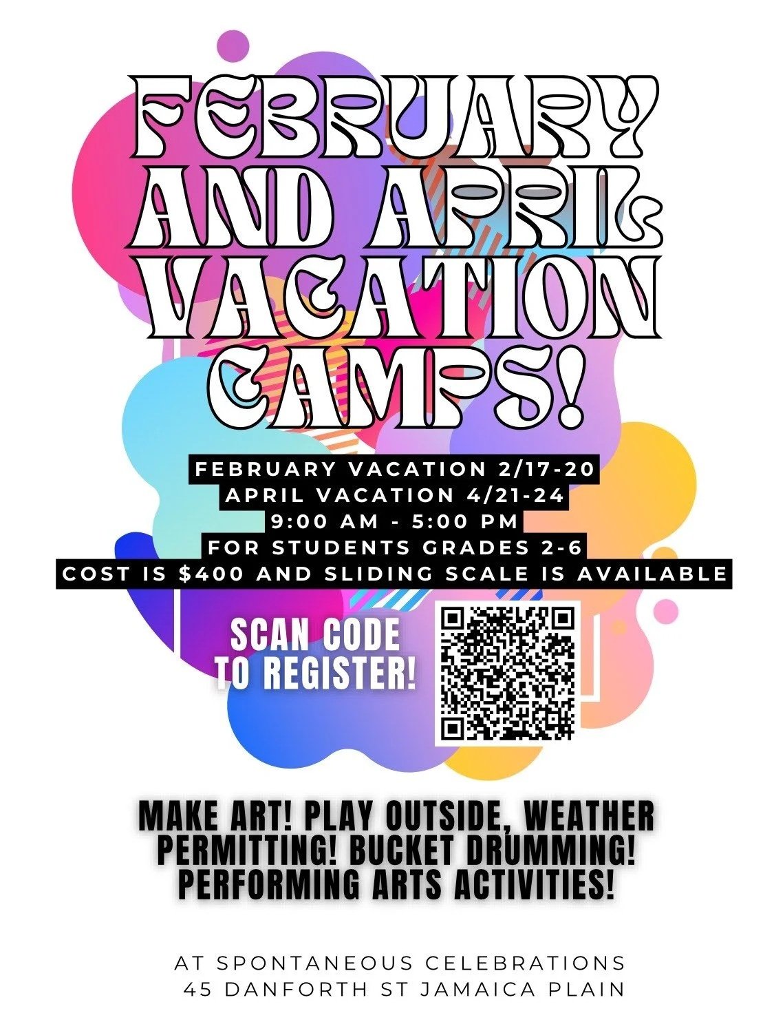 In this camp, youth will participate in artmaking, bucket drumming, and performing arts activities, with an emphasis on creative play and moving our bodies! The group will also play outside, weather permitting.