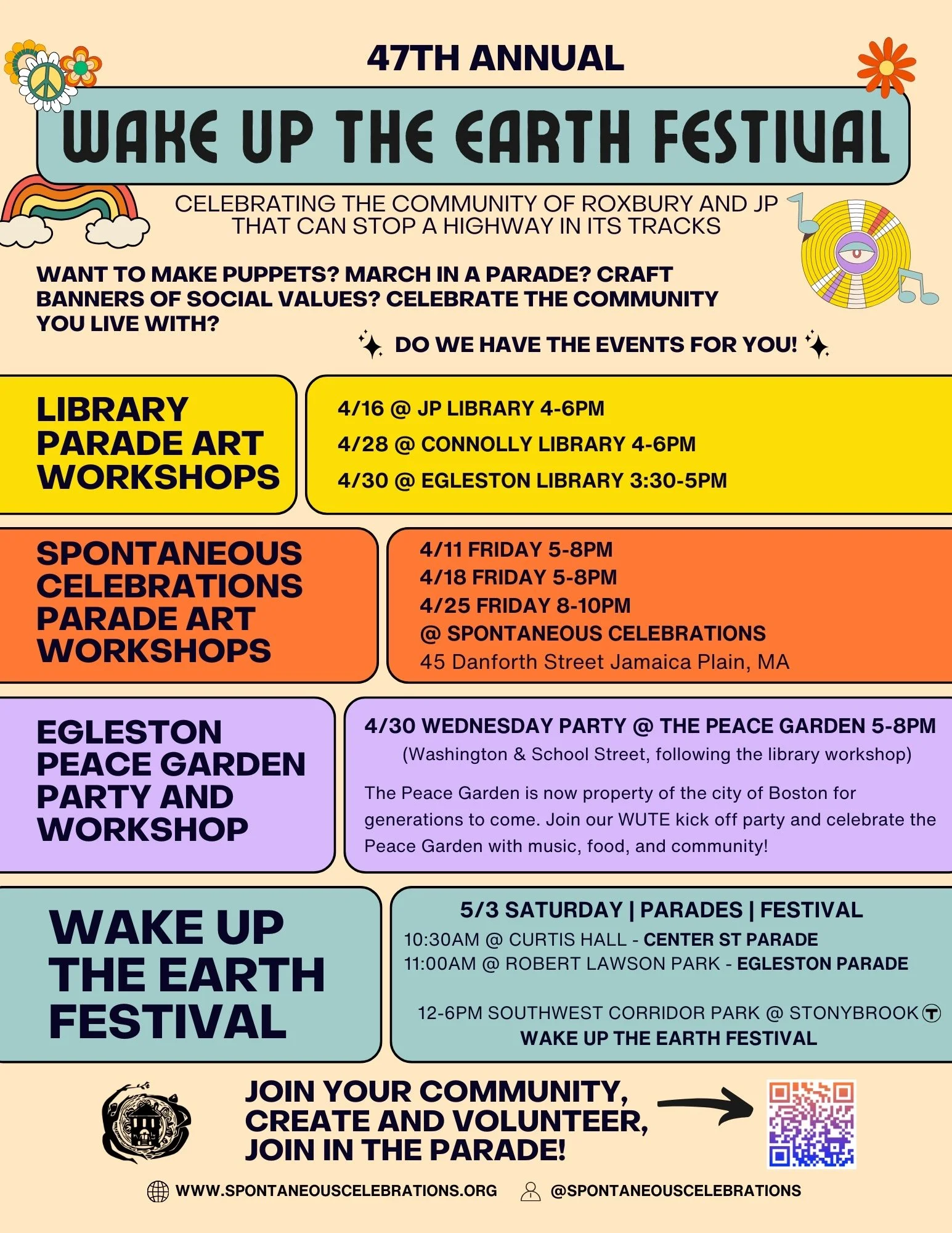 Welcome to the official info hub for the 47th Annual Wake Up the Earth Festival! Get ready to mark your calendars for Saturday, May 3rd, 2025—from 12 to 6 PM; we're taking over the day. Feeling extra festive? Our parades are rolling out early: at 11 AM from Curtis Hall and at 11:30 AM from the Egleston Square Peace Garden.