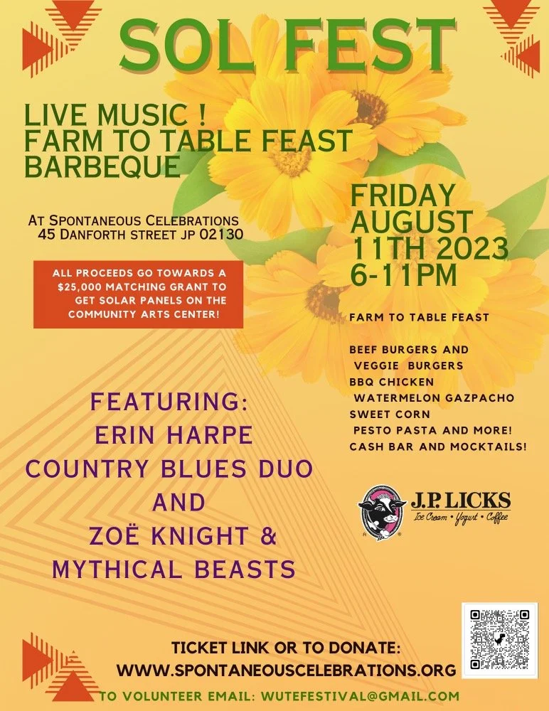 Community members who want to help Spontaneous Celebrations meet the TernSOLAR grant’s challenge can donate at spontaneouscelebrations.org/donations or mail their contributions to Spontaneous Celebrations 45 Danforth St. Jamaica Plain, MA 02130, or attend the Sol Fest Fundraiser Party on Friday August 11th at 6pm to 11pm at 45 Danforth St.