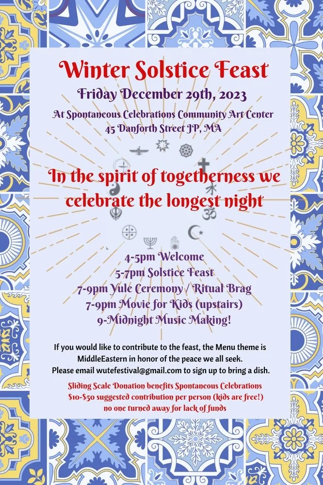 Join us in the longest night from sundown till midnight. Semi-potluck feast, Middle-Eastern is the theme this year in a prayer for Peace. Our Wake Up the Earth festival director Bonnie has been hosting a winter solstice feast and in the tradition of the Nordic pagans, a Yule brag, every year for 25 years or so. This year she is bringing her feast to Spontaneous. If you want to cook a dish please let her know in advance at wutefestival@gmail.com Drinks and desserts welcome! There will be a cash bar for 21+ Donations are welcome and will go to our Tern Solar Challenge Grant. The feast is from 5-7, ritual at 7, movie upstairs for kids and music jam from 9-12 (kicked off by local band Bojo and Eddy).